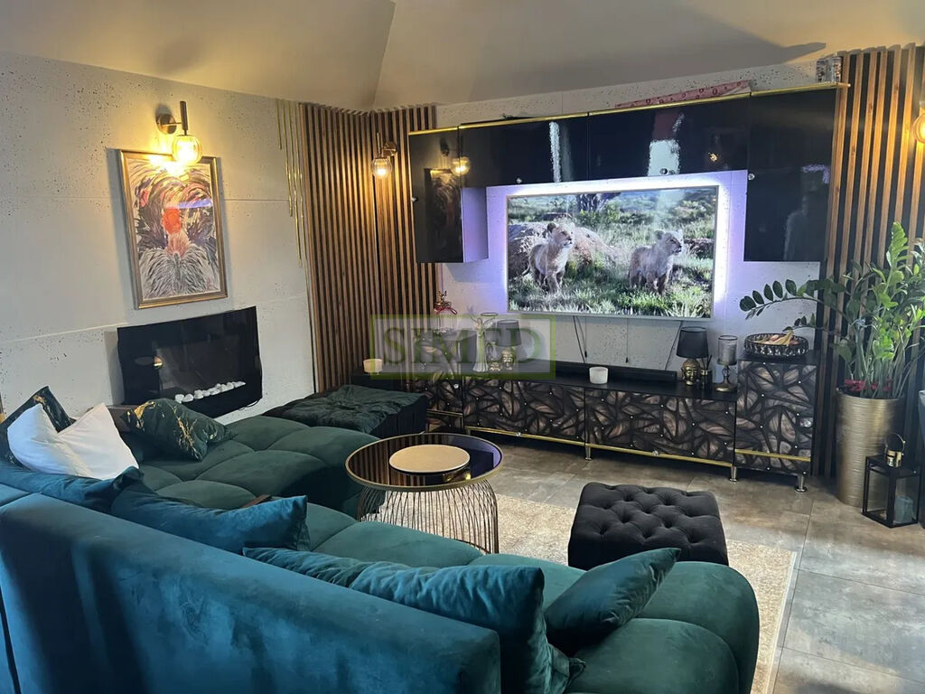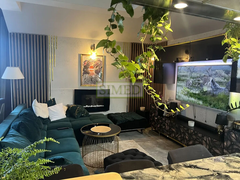 przestronny salon z biokominkiem i klimatyzacją